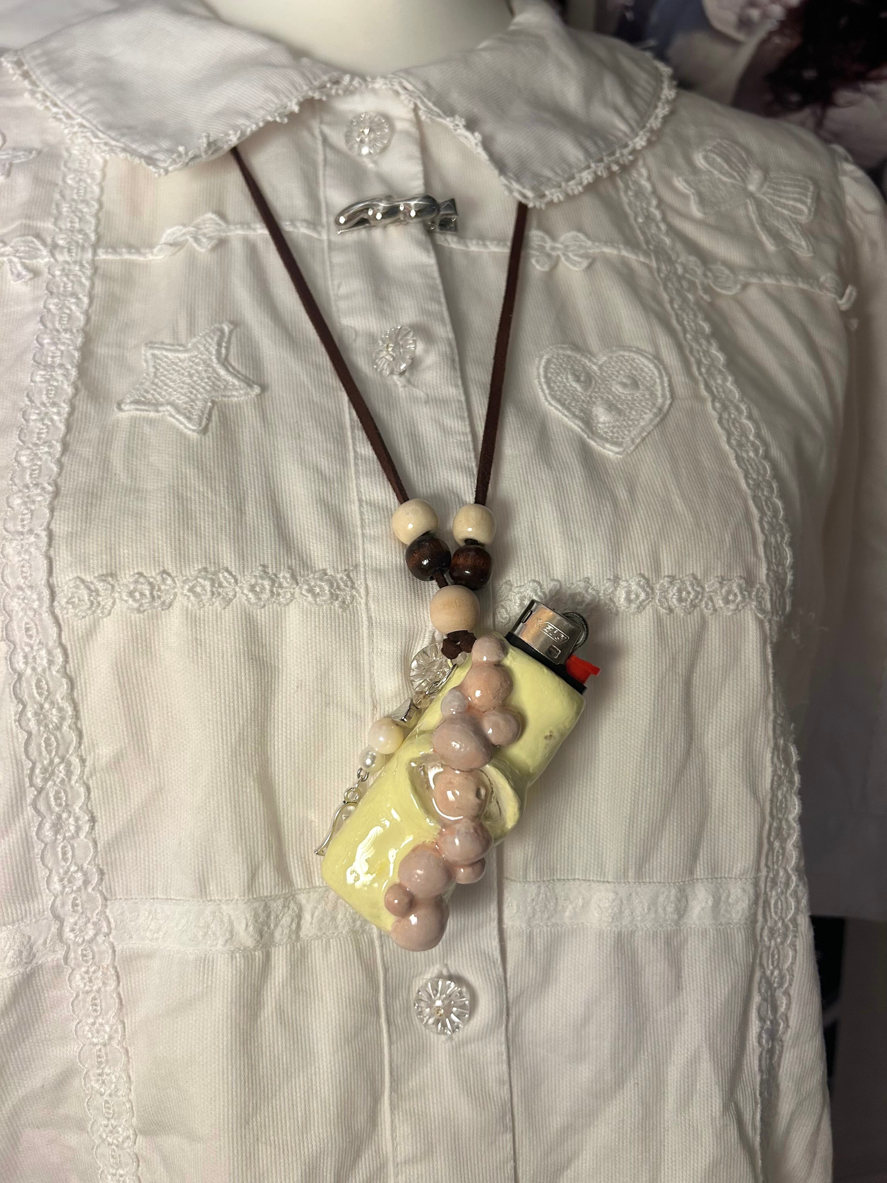 ポップだけど少し毒々しい目玉のライターケースネックレスです。柔らかいベロア調の紐と丸いビーズも特徴です。